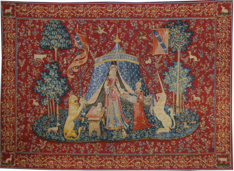 A Mon Seul Desir tapestry is one of the famous medieval unicorn tapestries of the Lady and the Unicorn series from the 15th century. This reproduction is of one of the six tapestries that make up the La Dame a la Licorne (The Lady and the Unicorn). The exact meaning of this tapestry is by far the most mysterious. The Lady is seen placing her jeweled necklace into a jewel box, and it is believed to represent the refusal of temptation, as well as the self-denial of the five senses detailed in the other works in the series.