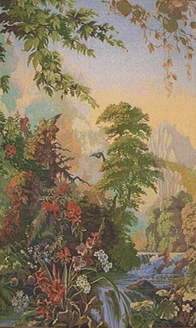Agapanthes tapestry is the left half of the Jardin des Delices tapestry. This is taken from a 19th century wallpaper design which was itself taken from an 1861 painting by Joseph Fuchs entitled "Eden". Today it is a very high quality wall-hanging tapestry woven by a long-established French weaving company.