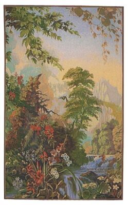 Agapanthes tapestry is the left half of the Jardin des Delices tapestry. This is taken from a 19th century wallpaper design which was itself taken from an 1861 painting by Joseph Fuchs entitled "Eden". Today it is a very high quality wall-hanging tapestry woven by a long-established French weaving company. This version features a narrow brown and beige border around it.
