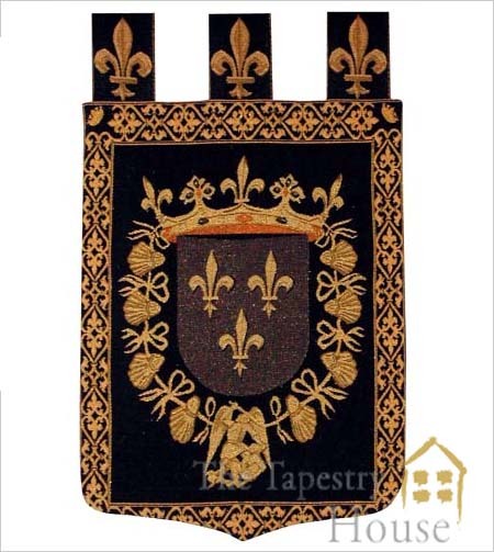 The Arms of Blois tapestry is woven in France - one of few tapestries showing coats of arms. The tapestry is lined, with attached loops/tabs for easy hanging. (The background colour is a dark blue.)