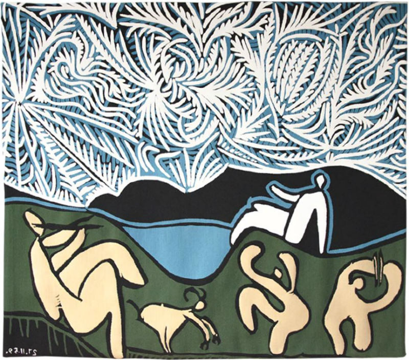 The Bacchanal with Goat and Spectator tapestry reproduces the Pablo Picasso 1959 linoleum cut Bacchanale avec Chevreau et Spectateur.