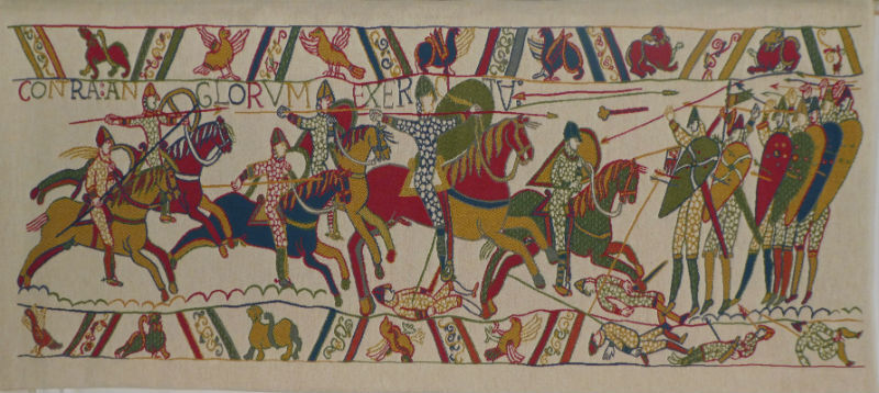 Today's reproductions of The Bayeux Tapestry are woven by several French and Belgian companies. Those listed below match the above tapestry having the same yarns and colour tones. This list is useful when hanging matching Bayeux tapestries together.