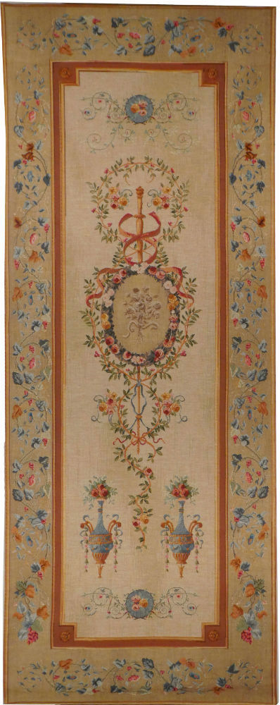 Bouquet Portiere is one of a pair of elegant French tapestries, the other being the Statue Portiere. This late 18th century portiere wall hanging is woven in France today based on the original hanging in the Hotel de Crillon. It is woven in 80% cotton and 20% viscose and is lined and has a rod pocket for easy hanging. We supply instructions for the care and hanging of tapestries with each order.