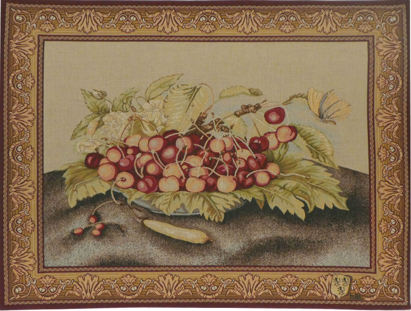 The Bowl of Cherries tapestry is inspired by a painting of Giovanna Garzoni (1600-1670) which is now at the Pallazzo Pitti in Florence. This tapestry is woven in France by Jules Pansu and is woven in 95% cotton. It is lined with a rod pocket for easy hanging. This tapestry is no longer available from the weaver.