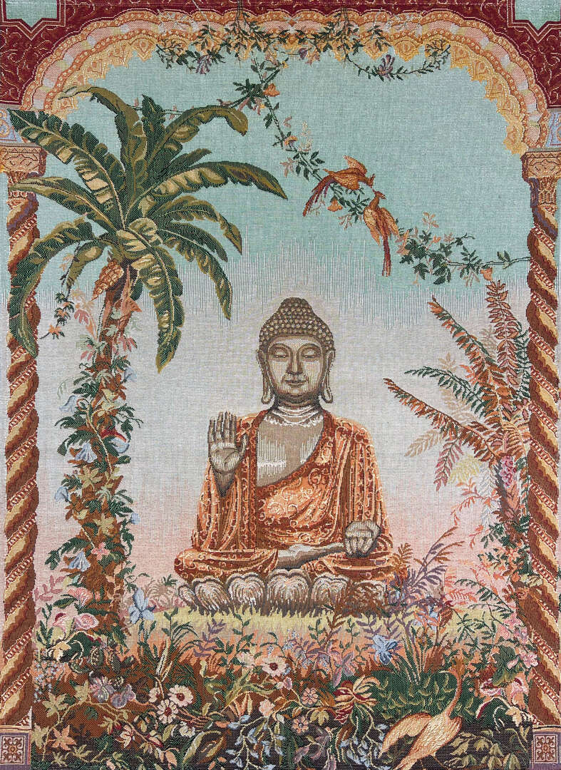 This jacquard wall tapestry in oriental style of the XIXth century represents Buddha sitting in a shell behind a flowerbed with an elegant palm tree on the left. Woven in cotton,...MORE