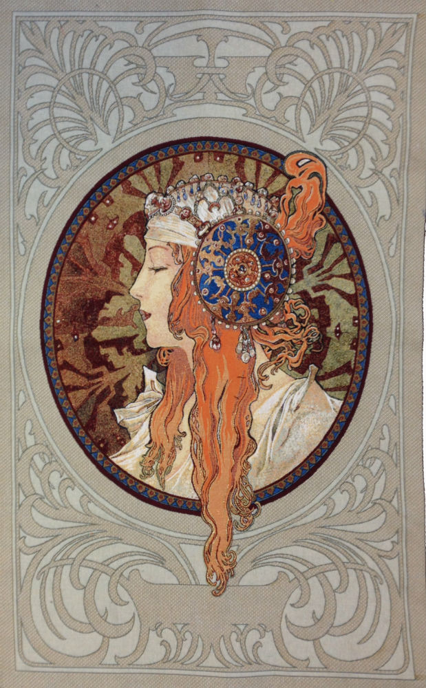 The Byzantine Head Auburn Red tapestry by Alphonse Mucha is from a pair of colour lithographs Mucha designed in 1897: a matching pair featuring a brunette. We admire the beautiful jewelry in her hair. (Mucha created the Byzantine border since he felt that the Byzantine period was a strong influence on his Slavic culture resulting.)