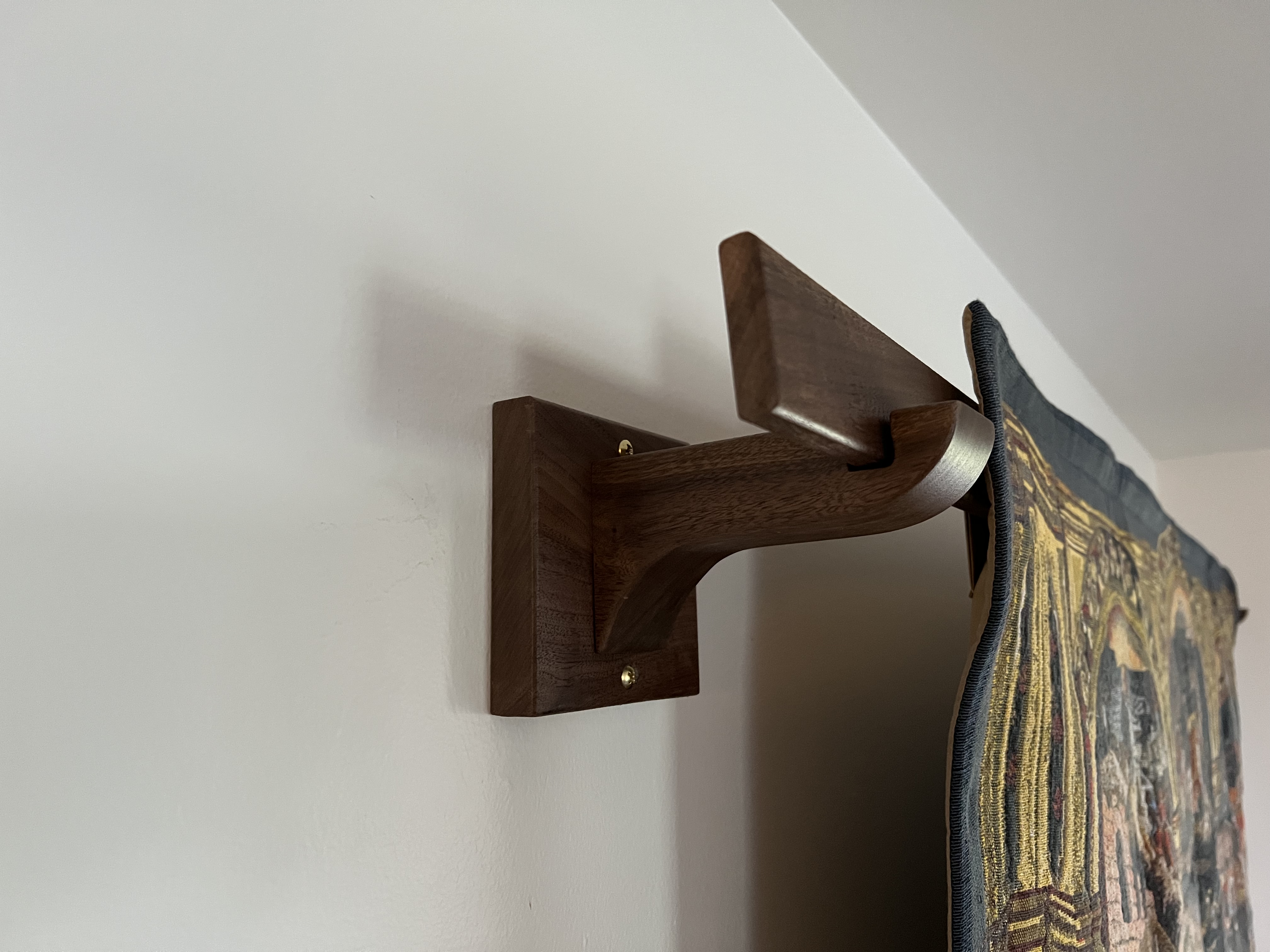 - A more decorative option (shown below, on upper right) is to buy wall decor rods, having brackets and varying finials, made of wood or metal and designed to hang and display tapestry wall hangings. These can be bought from home interiors stores, hardware or drapery stores. Some rods are also expandable.