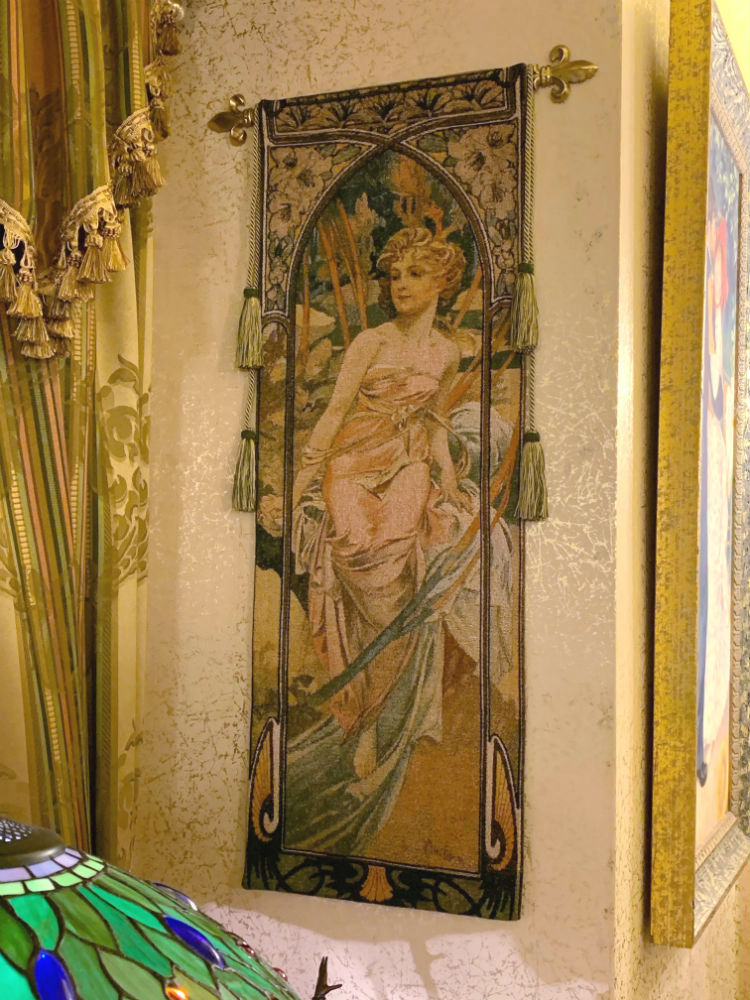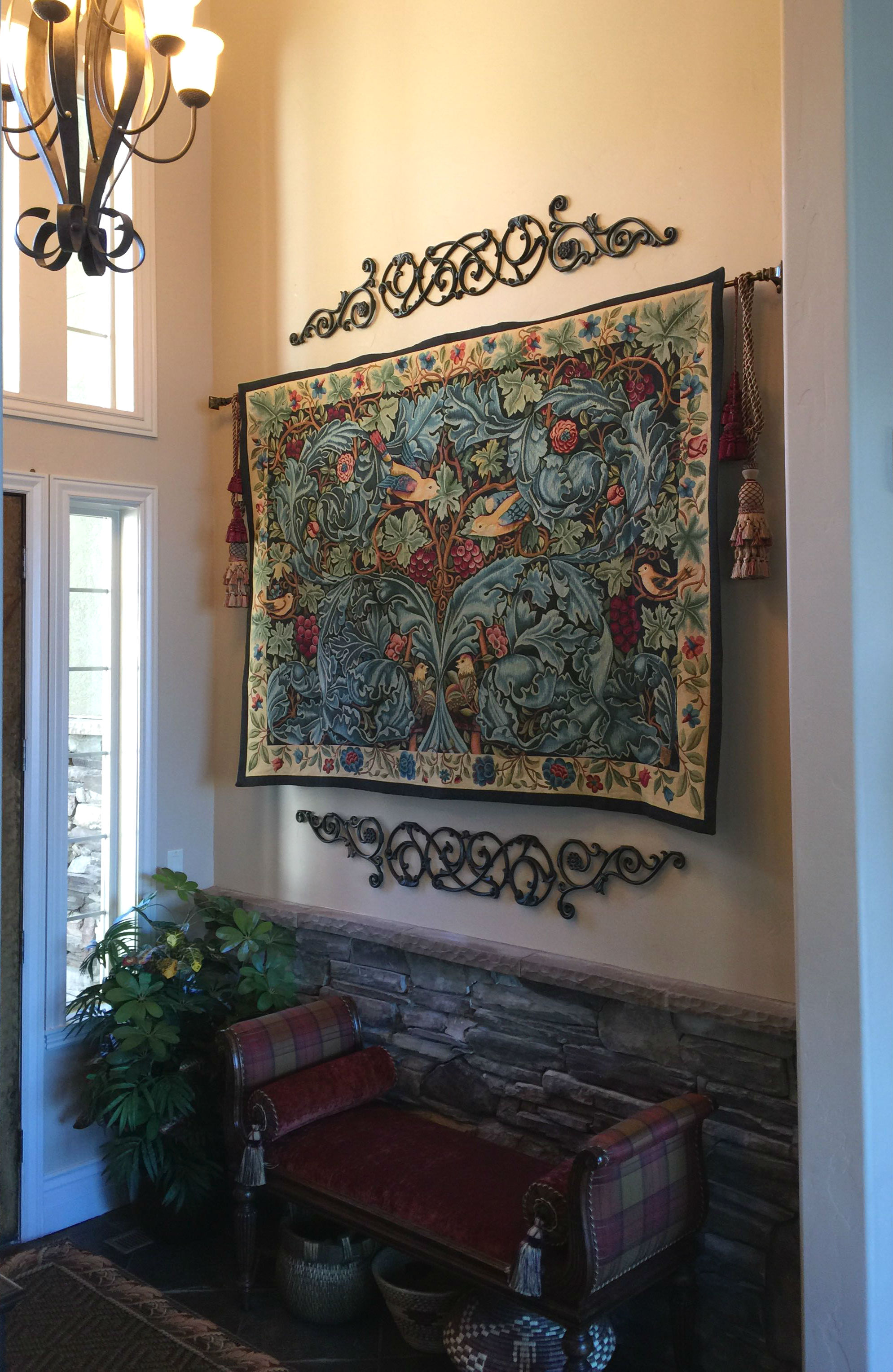 Hanging a tapestry is easy (really!). First, do note that since tapestries are woven individually there may be irregularities in the weave or they may have hanging undulations. They will not be precisely square and flat like a framed print.