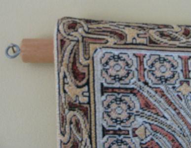 - The most economical way is to use a wooden rod. This can simply be a length of wood doweling cut to size from a hardware store or building supplier. For smaller tapestries it need only be about a finger-sized thickness, for large hangings a flat batten (as pictured below) might be better. For dowelling, the easiest way to attach it to a wall is to insert small cup-hooks into each end then place these over small protruding picture nails. This is handy since it will leave only pinprick holes if you change its position later.