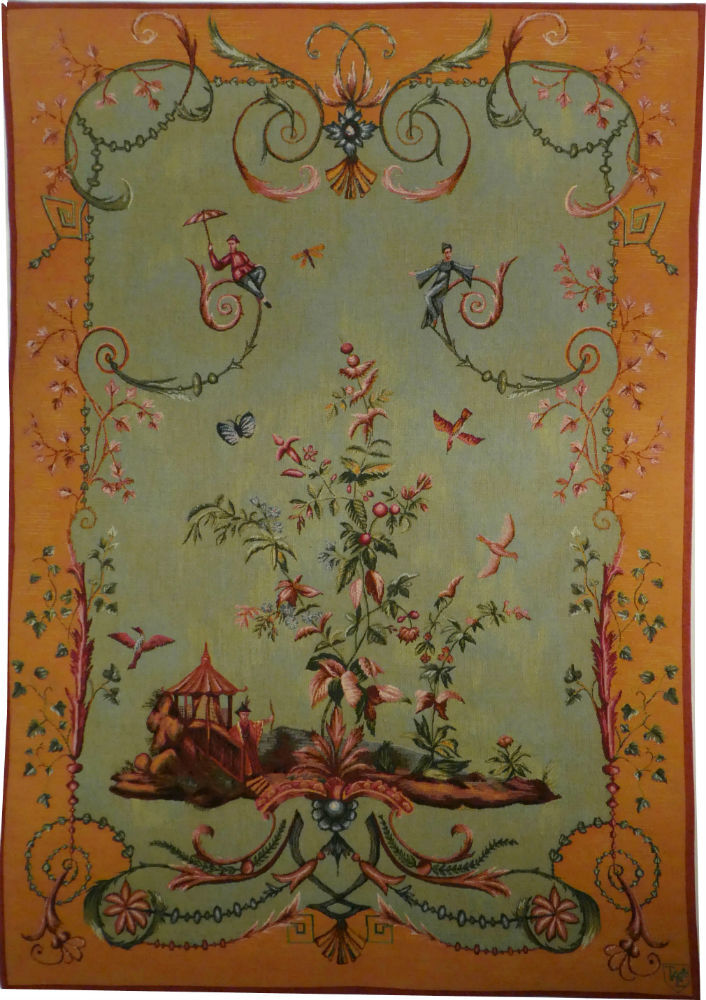 Chinoiserie tapestry wall-hanging is from the "Salons Chinois" Chinese tapestries series in the middle of the 18th century. It is now woven in France in a high quality 50% wool and 50% cotton weave. The tapestry is lined, with a rod pocket - we provide tapestry hanging information with each order.