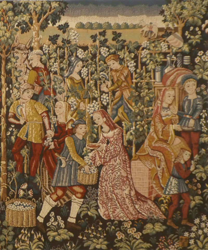 Cluny Museum the Grapes Harvest tapestry is the right half of the celebrated Vendanges tapestry exhibited at the Musée de Cluny - Musée national du Moyen Âge. This is the finest quality reproduction of the early 16th century medieval tapestry masterpiece. Today it is woven in France by Jules Pansu, a long-established weaving company. The tapestry is woven in a superb 77% wool and 20% cotton weave and is lined for ease of wall-hanging - we supply instructions for hanging a tapestry with every order. As well as the full scene and this half we also offer the matching Pressing the Grapes wall tapestry.