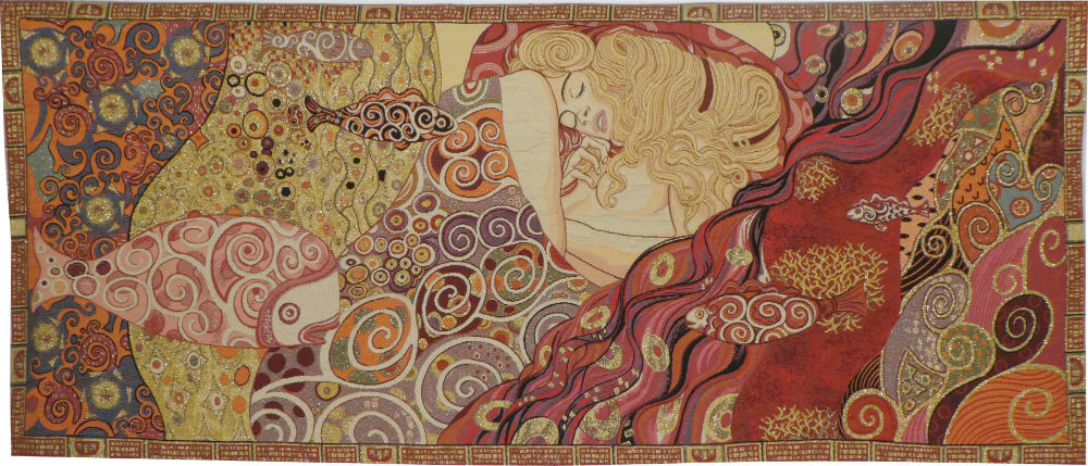 The Danae tapestry was originally a painting by Gustav Klimt (1862-1918) from 1907. Danae shows the central motif of the painting with additional design. Zeus seduces Danae who gives birth to their son Perseus who later accidentally kills the king of Argos, her father. In this Italian tapestry she is shown giving herself to Zeus. The original is exhibited at the Galerie Wurthle in Vienna.