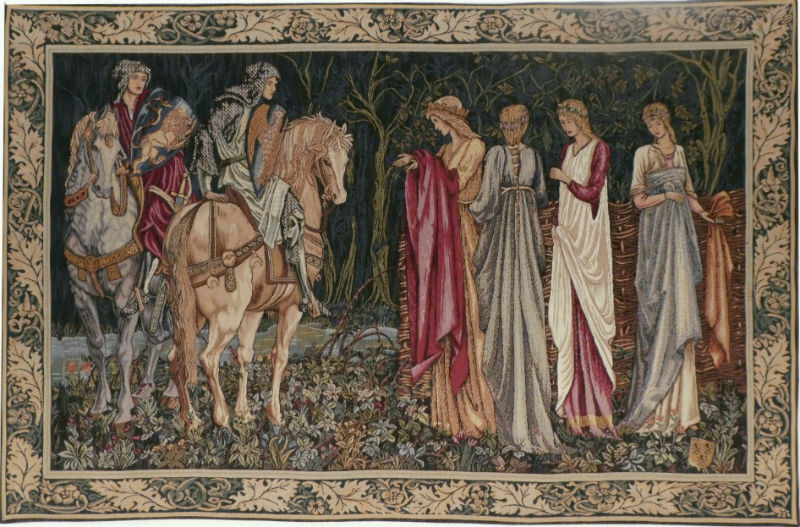 The Departure of the Knights tapestry by Edward Burne-Jones (1833-1898) is from the series The Quest of the Holy Grail woven in the 1890's by Morris & Co. The Knights of the Round Table and the Ladies of Camelot are seen in this fine French tapestry. The tapestry is woven in France by Jules Pansu, in an top quality 95% cotton weave and it is lined, with a rod pocket for easy wall-hanging. - we provide tapestry hanging information with each order.