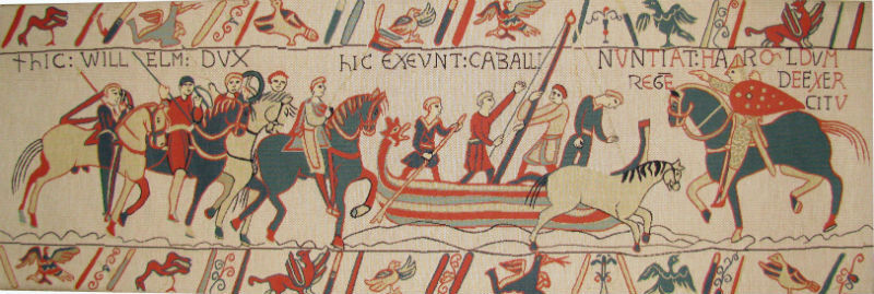Bayeux Tapestry - Duke William. This action-packed scene from the 11th century Bayeux Tapestry shows Duke William embarking from France with his cavalry and a ship. It is woven in France and is lined, with a rod pocket for easy hanging. A smaller detail (18"x25") is also available of the Duke William tapestry.