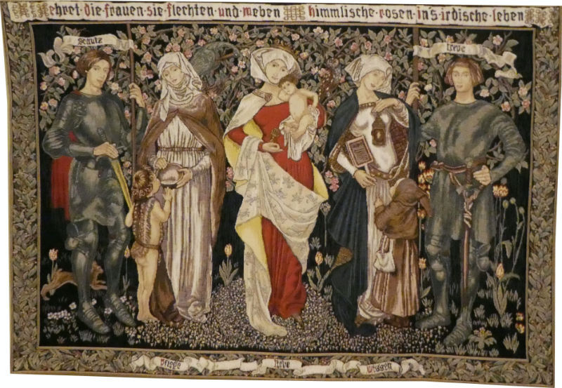 Ehret die Frauen tapestry was designed by noted Pre-Raphaelite tapestries artist Marianne Stokes (1855 - 1927). The name Ehret die frauen, meaning "Honour the Women", was inspired by Friedrich von Schiller's 1796 poem Wurde der frauen (Woman's worth). Woven for Morris & Co by John Martin and Gorden Berry in 1912 it shows a group of figures representing (from left to right): Courage, Caring, Love, Wisdom and Fidelity. The verse, designed in gothic type, reads Ehret die frauen sie flechten und meben • himmlische rosen ins irdische leben (Honor the women! They braid and weave Heavenly roses into earthly life).