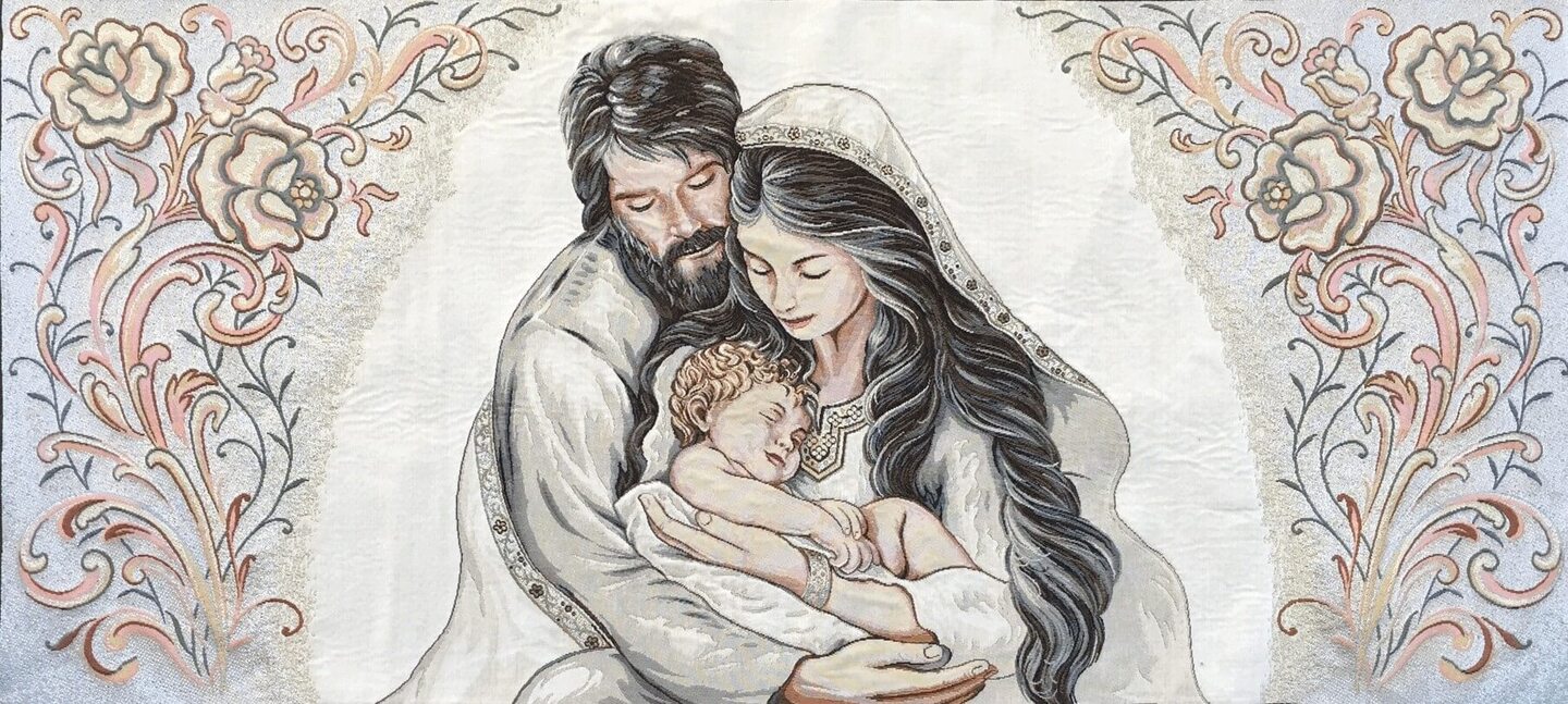 This stunning Italian woven Family Love tapestry signifies the love between parents and their newborn infant. Their warm embrace offers warmth and security to their precious child. A wonderful baby shower gift!