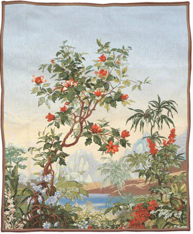 The Flamboyant Tree tapestry is the right half of the Sous les Tropiques tapestry. This high quality wall-hanging tapestry is woven by a long-established French weaver, Jules Pansu.