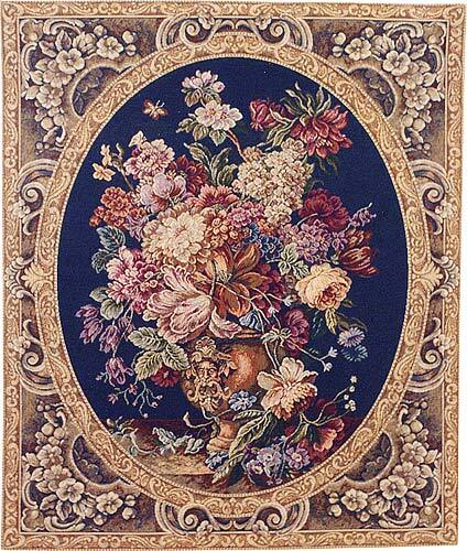 The Floral Composition tapestry with a blue background is one of our finely woven Italian wall tapestries. It is hand-finished and fully lined, with a rod pocket for easy hanging.