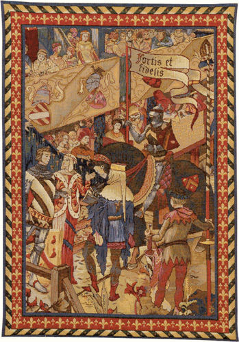 Fortis et Fidelis tapestry is a splendid detail from "Une descente de tournoi à la fin du XVème siècle" which was drawn by Jean-Paul Laurens and originally woven at the Manufacture Royale des Gobelins, Paris in 1895-1899. Laurens was a strong supporter of the Third Republic and painted in the French Academic style. Fortis and Fidelis is a detail from his much more medieval styled tapestry of a fifteenth century tournament, It is now available in several formats. This French wall tapestry is woven in a very fine quality wool and cotton weave, lined, with a rod pocket for easy hanging.