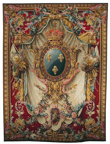 The French Coat of Arms tapestry on a burgundy background - a fleur de lys tapestries wallhanging showing the coat of arms of France. This tapestry is also available with soft gold tones. The tapestry is finely woven in France in a high quality 50% wool and 50% cotton blend and lined with a rod pocket for easy hanging. We supply instructions for the care and hanging of tapestries with each order. Please note that the larger size is non-returnable.