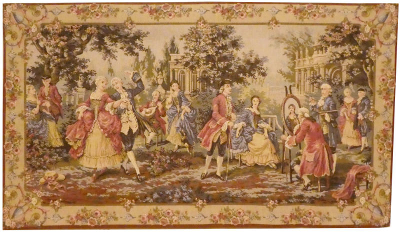 The French Garden tapestry, right side shows 18th century leisurely aristocrats during the reign of Louis XV. This scene of art, music and dance is inspired by the paintings of...MORE