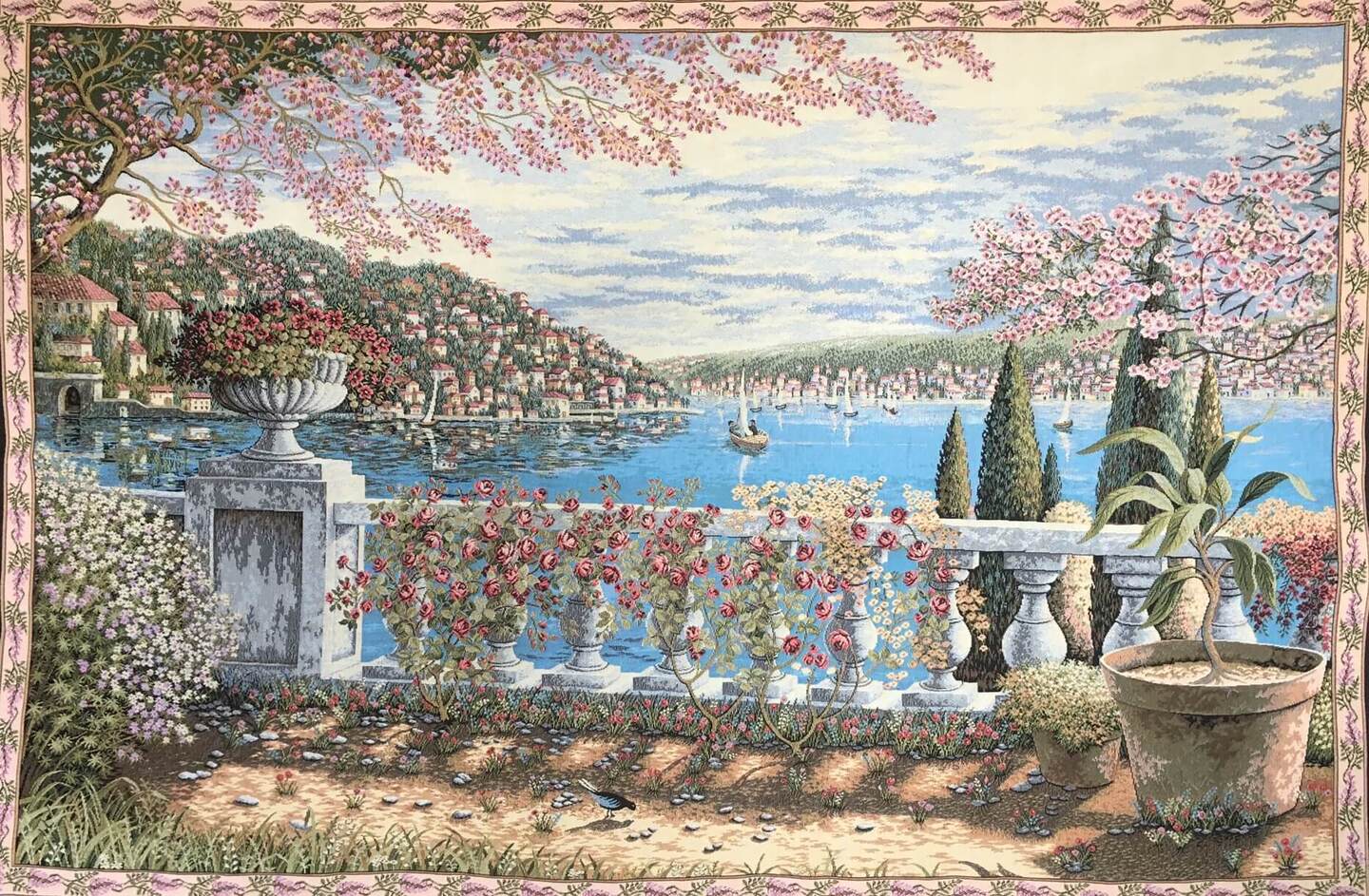 Lake Como, Italy offers a new level of opulence, where shiny red Ferraris weave through narrow lakeside towns and movie stars seek their privacy within their neo-classical villas and gardens. Some scenes of the 2006 James Bond movie "Casino Royal' were filmed here. This tapestry shows a stunning view of the mountain gardens overlooking the lake. This fine tapestry is woven in Italy - in 80% cotton, 20% rayon and polyester.