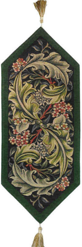 The Green William Morris table runner illustrates the shorter version of this design in two sizes. See the larger table runner, The design is the same on that with burgundy edging. All are woven in France by a long-established tapestry weaver and they are lined with a cotton tassel at each end (the size includes these).