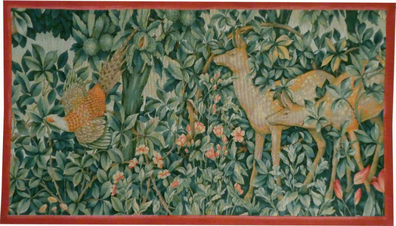 The Greenery Tapestry - Right Side is a version of the original John Henry Dearle tapestry wall-hanging now in the Museum of Fine Arts, Boston. Displaying much influence from William Morris, it shows a pheasant and deer. The original 1892 tapestry was woven at Merton Abbey by Morris & Co in wool and mohair; our adaptation is woven today in France in 72% cotton, 25% viscose and 3% polyester. The 1892 design was 7" high and over 15' long; ours is available in several formats: