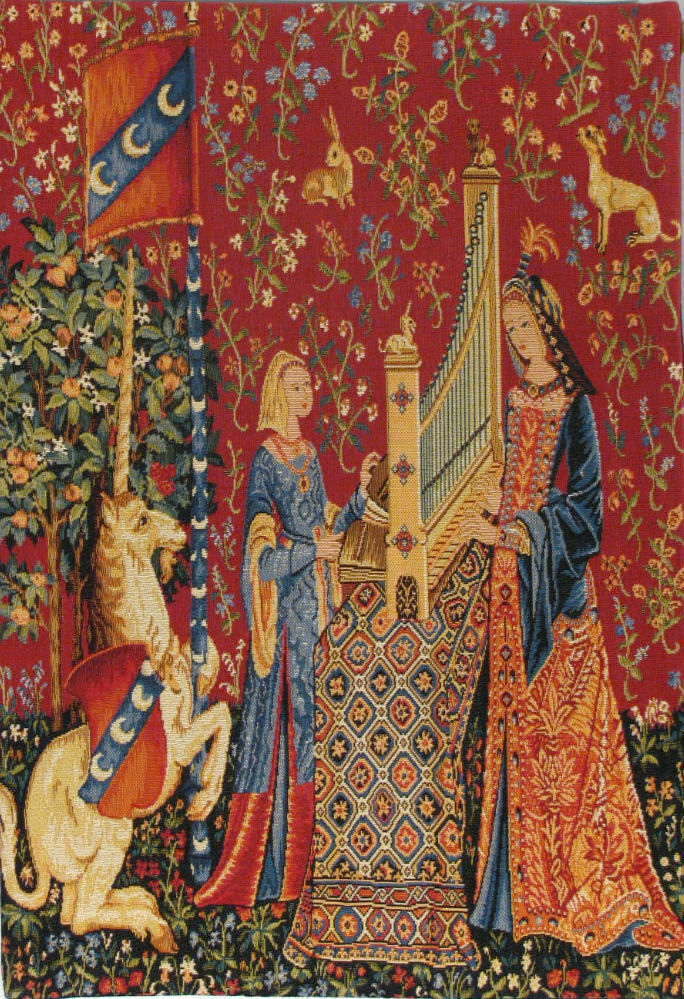 Hearing small tapestry - this 25"x18" wallhanging offers a detail of the popular Hearing tapestry. We have small tapestries presenting details of each of the Lady with the Unicorn tapestries. All these French wall-hangings are fully lined, with an attached rod pocket.