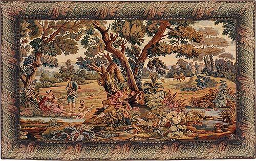 Hunters Rest tapestry is one of our Italian hunting tapestries woven in a cotton/viscose blend. It shows hunters with rifles by a lady and a dog next to a pond. In the distance we see can two horsemen galloping away. It is bordered and fully lined, with a rod pocket for easy hanging. We supply instructions for the care and hanging of tapestries with each order.