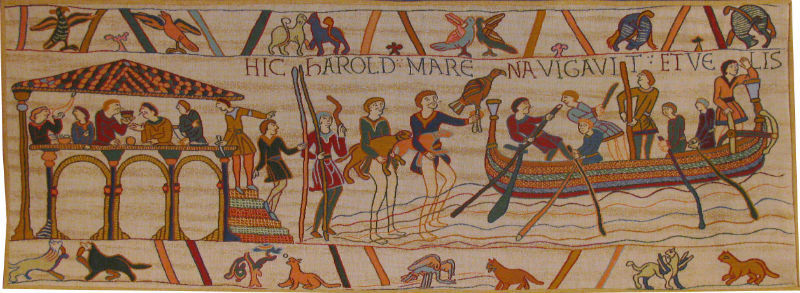 The Bayeux Tapestry - King Harold sails for Normandy in his armada. This version with no border is woven in France in two sizes and is lined, with a rod pocket - we provide instructions for the hanging and care of tapestries. The King Harold tapestry is also available with a border.