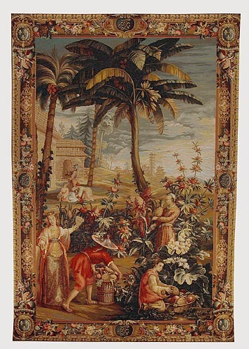 La Recolte des Ananas tapestry, also known as The Pineapple Harvest, is from a series known as "The Story of the Emperor of China tapestries", which originally included ten separate pieces. It shows the Empress, on the left, gesturing towards the plentiful fruit being harvested, with a pagoda and other buildings in the background. The scene also depicts other tropical fruits and plants, setting the context as Eastern and distinctly non-European. Typical of the "Oriental" style it is believed to have been woven between 1697 and 1705 and commissioned by Louis Alexandre de Bourbon (1678 - 1737), son of Louis XIV, and many of the details on the tapestry would never have been experienced by the artists firsthand. By the 1660's Jesuit missionaries returning from Asia provided these details in the form of engravings, which also created a great deal of public interest in life at the Chinese court. Of the original ten tapestries six can now be seen in the Getty Museum, Los Angeles.