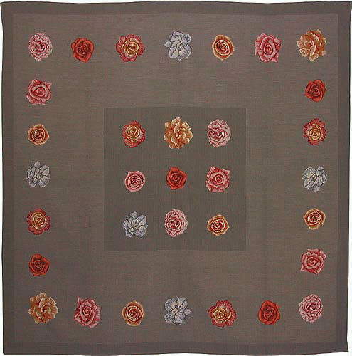 La Vie en Roses shows roses on a grey background. Woven in France in 80% cotton and 20% viscose, it is ideal as a tablecloth or a throw.