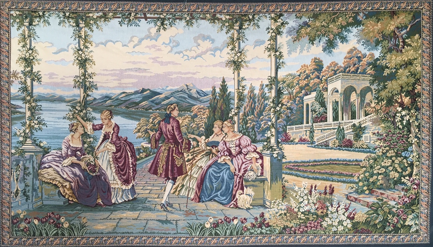 Ladies at Lake Como tapestry shows well-dressed aristocrats relaxing on stone benches on the lakeside terrace at the Villa d'Este. This 18th century scene is woven in the Lake Como region of northern Italy.