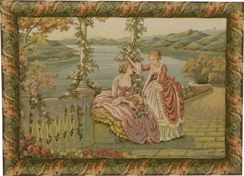 Ladies by the Lake is an Italian tapestry wallhanging is woven in the Lake Como region, centre of the best silk and textile weaving. It is set in the late 18th century and features gardens of the Villa d'Este at Cernobbio originally built in 1568 as a summer residence for a cardinal. These include Renaissance arches, a temple, ruins, statues and fountains. This tapestry is lined, with a rod pocket for easy hanging - we provide hanging information with every order.