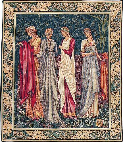 The Ladies of Camelot tapestry is one of a series called The Quest of the Holy Grail designed in the 1890's by Morris & Co. The series was inspired by Malory's famous poem Morte d'Arthur. Designed by Edward Burne-Jones, William Morris and John Henry Dearle between 1892 and 1895. This tapestry, correctly titled Les Dames de Camelot, was the second in the series, and we see the ladies of the court gathered to bid their farewell to the Knights of the Round Table.