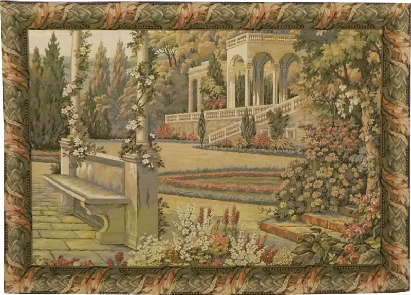 The Lake Como Gardens tapestry is on sale in our Lake Como tapestries selection. The formal garden scene is at the magnificent, classically elegant Villa d'Este on the lakeshore. With an acanthus border, this Italian tapestry (woven in the Lake Como region) is lined with a rod pocket - we provide wall-hanging information with each order.