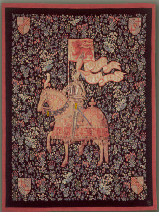 Le Chevalier tapestry, also known as the Montacute Knight tapestry, shows a knight carrying the coat of arms of Jean de Daillon (d.1481) an officer and adviser to Louis XI of France. The original was ordered from Wuillaume Desreumaulx of Tournai by de Daillon himself, although he never lived to see it completed. It was, however, delivered to his widow in 1483 and can now be found as part of the magnificent collection of textiles and tapestries in Montacute House, Somerset, England.