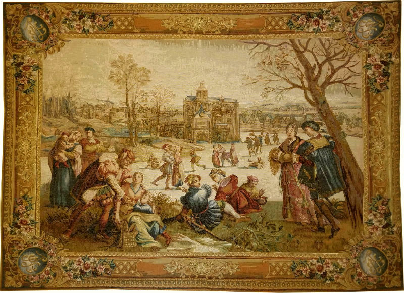 Les Patineurs - Skating tapestry is from the Months of Lucas series of tapestries dating from the 18th century. Copied from paintings and cartoons by Gobelins the works are often incorrectly attributed to Dutch artist Lucas van Leyden (1494 - 1533). It is believed they were inspired by the work of a number of artists and in the style of the day "enhanced" by Gobelins own artists and weavers. The scene shows Les Patineurs (the skaters) enjoying a cold afternoon skating on a frozen lake. The tapestry, woven in 1770, is rich in detail and demonstrates the skill of the Gobelins weavers and artists in capturing the colour and ambience of even complex, detailed paintings. The original can now be seen in the Elysée Palace, the residence used by the President of France to welcome foreign dignitaries.
