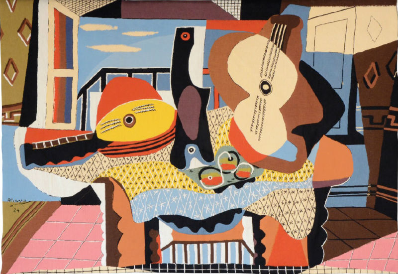 The Mandolin and Guitar 1924 tapestry is from a vibrant still life by Pablo Picasso. He painted this Cubist oil on canvas in Juan-les-Pins in 1924. The original now hangs in the Guggenheim Museum, New York.