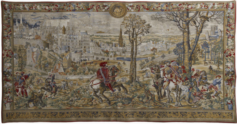 This superb version of the Medieval Brussels tapestry is woven in France. It features the Emperor Charles V on horseback in the center overlooking Brussels. On the far left is his royal palace which burnt down in 1731. The original tapestry is in the Louvre, Paris.
