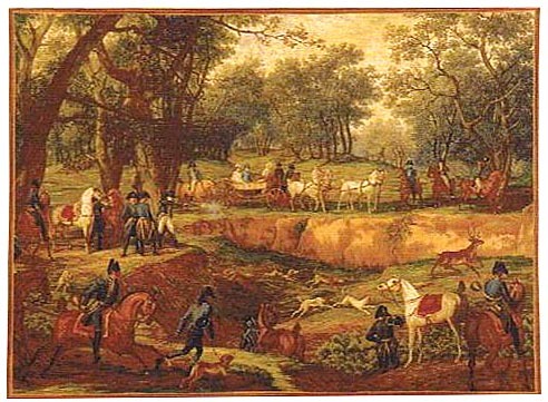 A fine French tapestry of the detail of a scene showing Napoleon in the Forest at Compiegne. Inspired by Carle Vernet whose paintings glorified Napoleon's military campaigns. It is also available as a larger tapestry set within a draped theatrical effect edge. Woven in France and lined with a rod pocket for easy hanging. We supply instructions for the care and hanging of tapestries with each order.