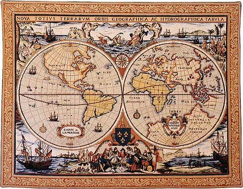 Nova Totius Terrarum tapestry is a reproduction of a 17th century map by Dutch cartographer Henricus Hondius (1597 - 1651). Its full title, Nova totivs terrarvm orbis geographica ac hydrographica tabvla, means "A new complete map of the geography of the earth and oceans", and reflects an impressive knowledge of world geography for its day.