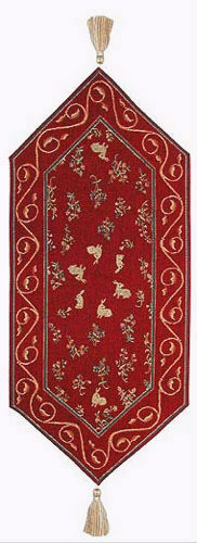 Rabbits table runner - a detail from the Lady with the Unicorn tapestries. It shows rabbits surrounded by mille fleur motifs on a red background. Woven in France and lined, with...MORE