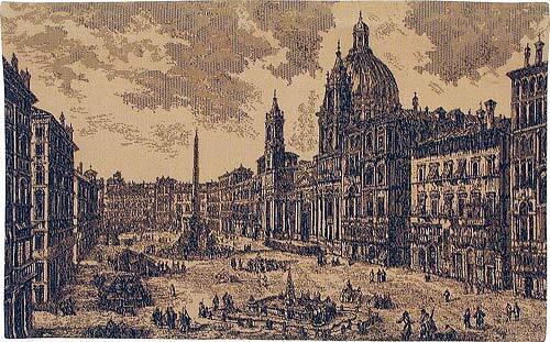 This Rome tapestry shows the Piazza Navona in sepia tones. It is woven in cotton and viscose and this Italian tapestry is lined with a rod pocket for easy hanging.