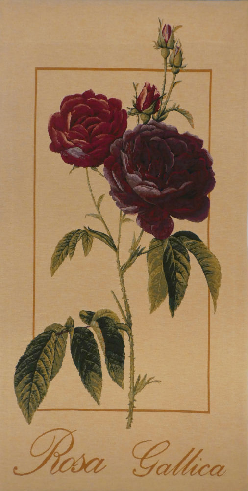 The Rosa Gallica tapestry is one many botanical wall tapestries inspired by the botanical paintings of Pierre-Joseph Redoute (1759-1840) who produced over 2,000 detailed reproductions of flowers. The Rosa Gallica tapestry is woven in France, lined with a rod pocket for easy hanging. It pairs superbly with the Papaver Somniferum tapestry. They have beed discontinued and are on sale!