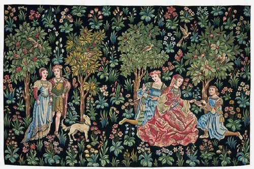 Scenes Galantes is a stunningly woven medieval milles fleurs tapestry showing young lords and ladies relaxing in an idealized setting. The French weaver, Jules Pansu, has wonderfully re-created it in a rich full wool and cotton weave, fully lined, with a rod pocket for ease of hanging. We enclose information about how to hang a tapestry with your order. Please note that this tapestry is non-returnable. This Medieval Gallant tapestry is also available with a rich border of leaves and flowers.