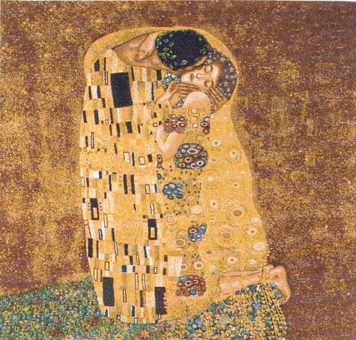 This Square Kiss tapestry by Gustav Klimt is here shown as a wonderfully priced French tapestry. It is woven with some golden fibers that make this tapestry shine.