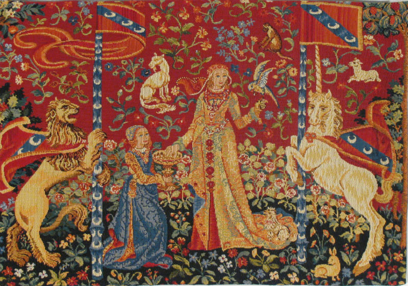 Taste small tapestry - this 18"x25" wallhanging offers a detail of the popular Taste tapestry. We have small tapestries presenting details of each of the Lady with the Unicorn tapestries. All these French wall-hangings are fully lined, with an attached rod pocket - we supply hanging information with each order.