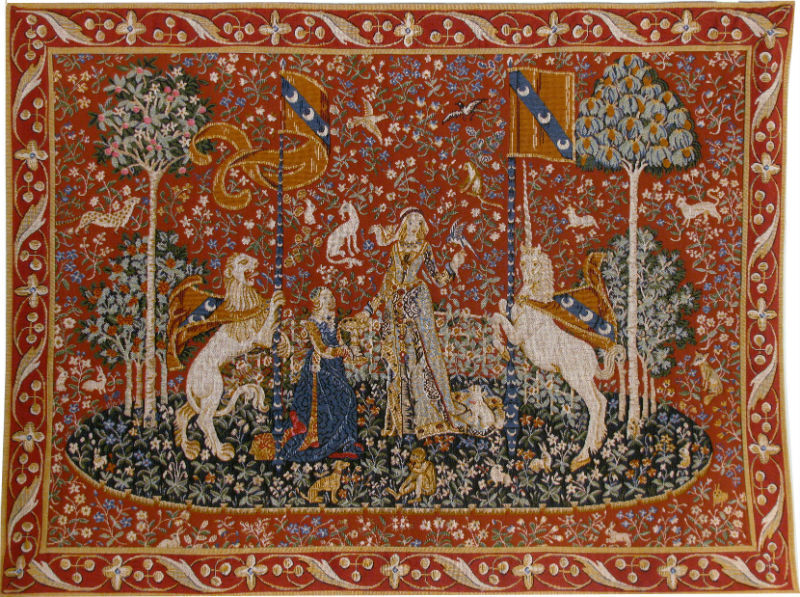 The Taste tapestry is one of the Lady with the Unicorn series of medieval tapestries. The originals are in the Cluny Museum, Paris depicting the senses, in their own magnificent display room. This version is a new French tapestry (also available without the border) and it is lined, with a rod pocket for easy hanging.